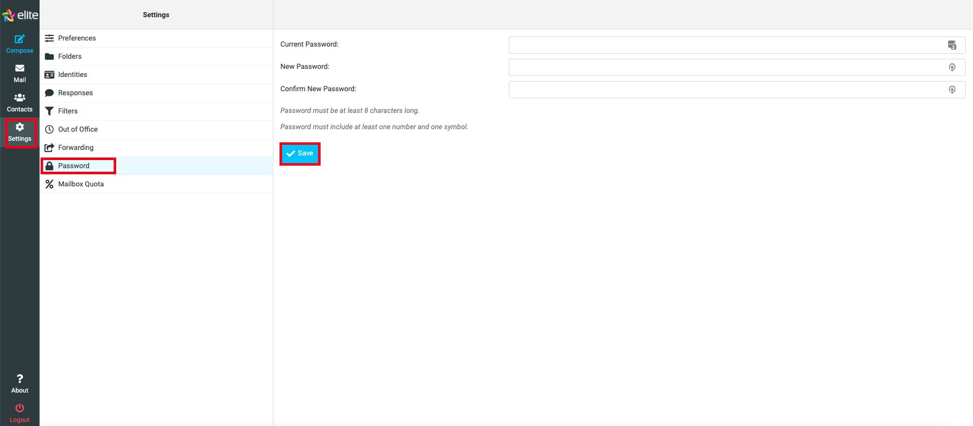 How to change your Email Password When logged into WebmailSelect the Settings icon from the left-hand menuSelect PasswordEnter your current PasswordEnter your new Password/Repeat new passwordClick SAVE when done Published 05/08/2020 09:05